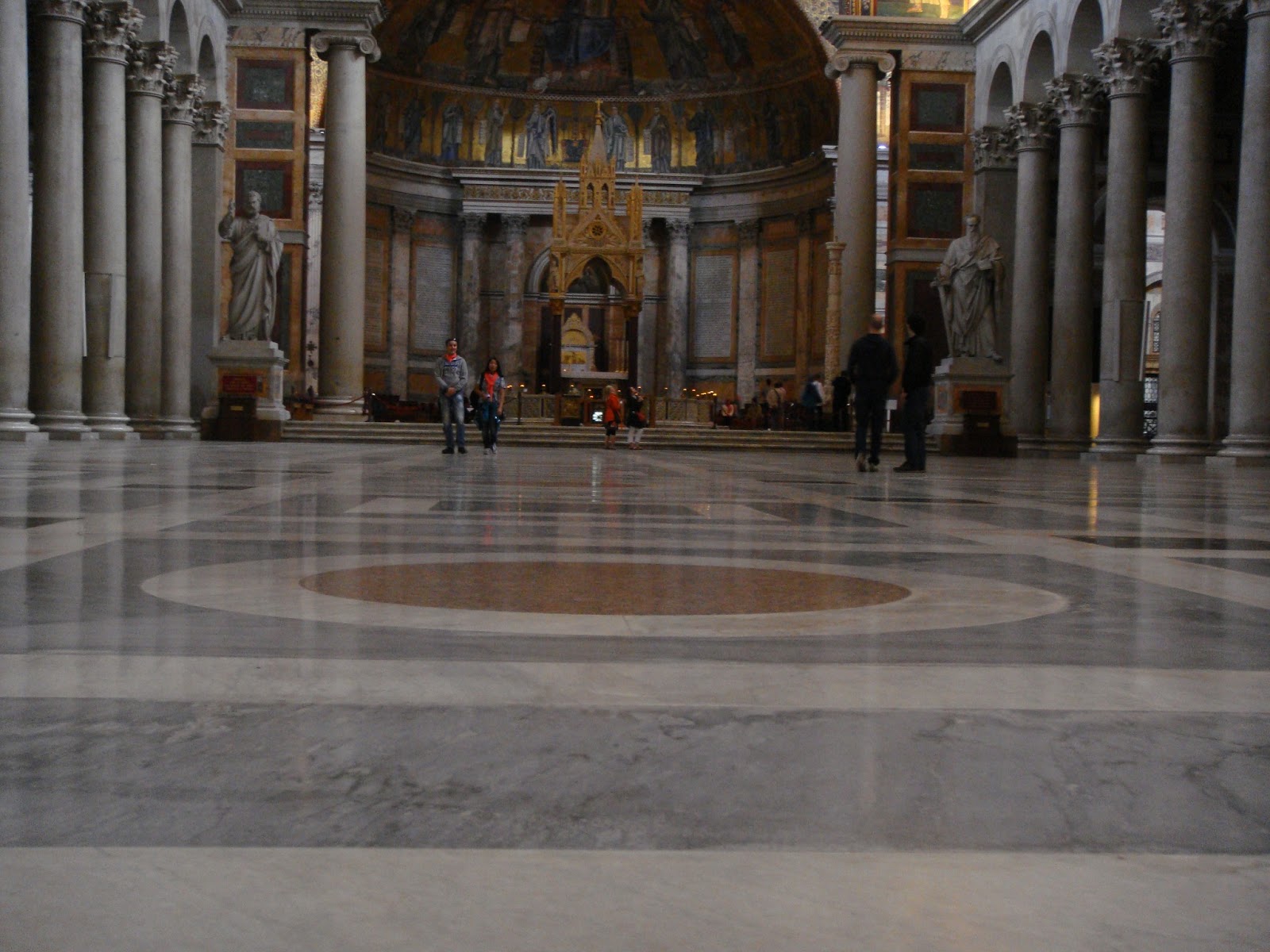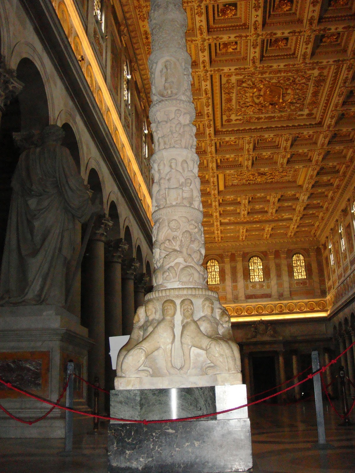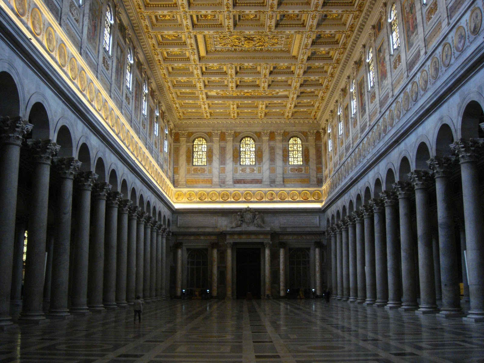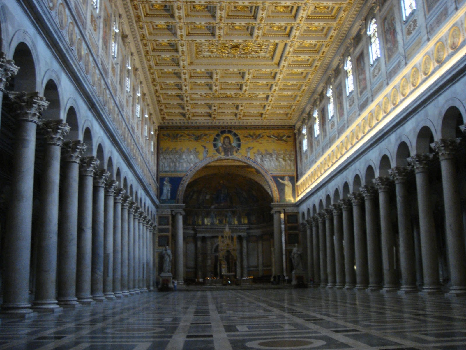 Revenind la San Paolo…Este wow din toate punctele de vedere.Primul cand am intrat:Wow,cate coloane,wow ,ce frumos e tavanul,wow,ce curat este!O serie intreaga de wow.Si intrand in basilica wow-ul nu mi-a mai iesit ca am ramas cu gura cascata.131 m de biserica ca lungime,65 m latime si o inaltime de aproximativ 30 m.Aici din nou coloane,mai exact 2 randuri de coloane cu un total de 80 de coloane.Wow!Paream niste furnicute in imensitatea care domnea.Inaintand,descoperim altarul numit ,,Ciborio” care este ridicat deasupra mormantului Sfantului Petru din care se poate vedea doar o mica parte.Aici se afla si ,,confessio” locul din fata mormantului si unde te poti ruga.Chiar deasupra ,,confessio-ului” se afla lanturile care le-a purtat Sfantul Pavel in timpul martiriului,protejate de un geam.