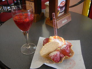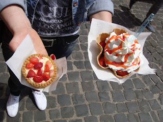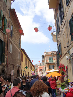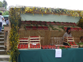 Ajunsi acolo,mare problema mare am avut cu gasirea locurilor de parcare.A trebuit sa parcam la un km sau mai mult fata de locul unde avea loc festivalul.Or fi ele frumoase stradutele inguste dar tare nu sunt practice.Dar ne-a trecut repede supararea cand am inceput sa vedem la orice pas fragi si capsuni iar mirosul lor…mmm.Fragii si capsunile erau vedetele si le gaseai in orice combinatie vroiai:cu iaurt,cu frisca,cu inghetata,cu orez si chiar au facut si salam cu fragi,destul de ciudata combinatia,nu am gustat dar trebuie sa fie…interesant.In rest,la celelalte nu am putut rezista tentatiei.