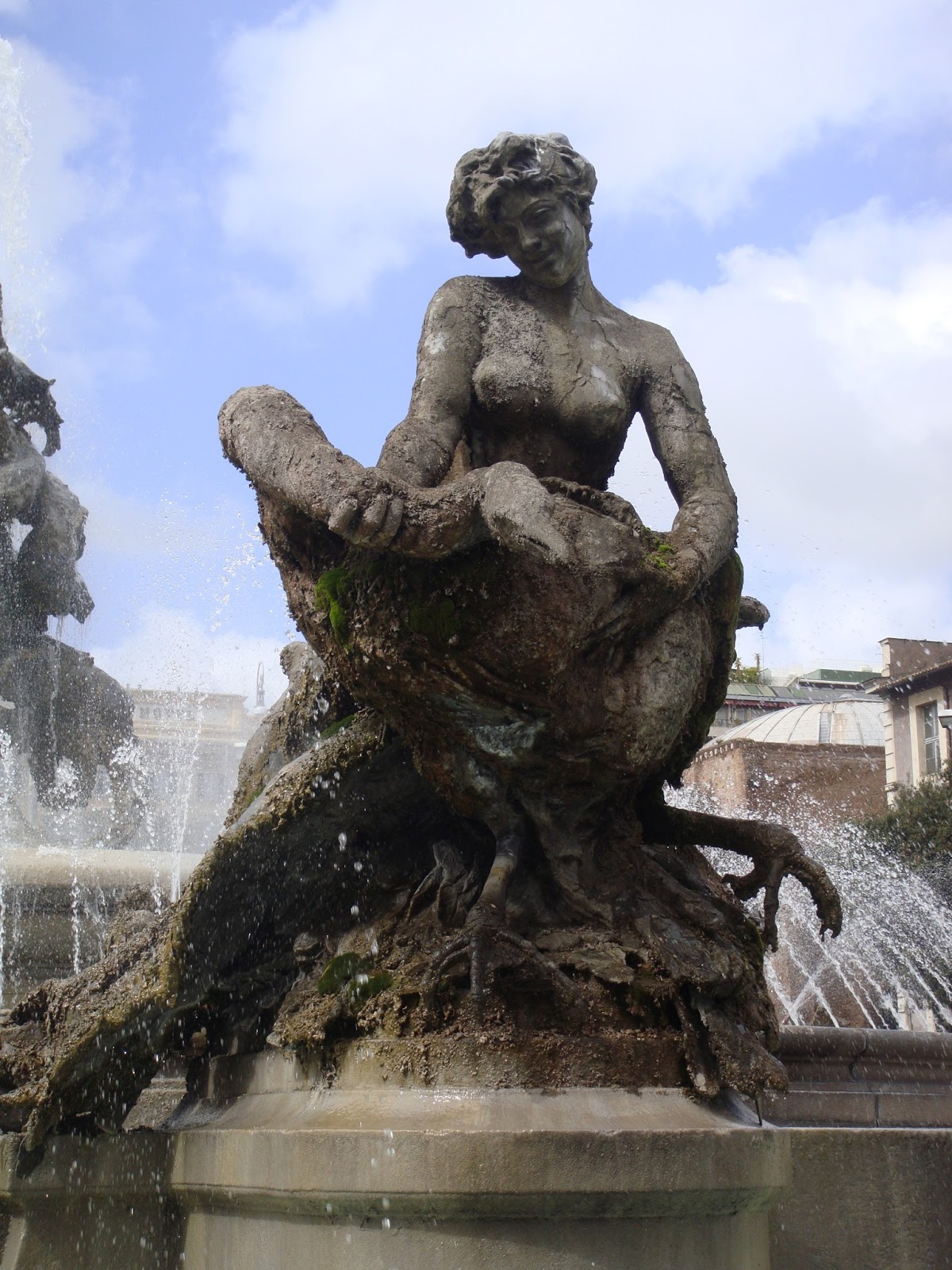 In centrul pietei se afla Fantana Naiadelor(cea care da spectaculozitate pietei).Este opera lui Mario Rutelli care a realizat aceasta opera in anul 1901.Naiadele sunt nimfe care guverneaza apele dulci ale pamantului si cica ar avea puteri vindecatoare si profetice.Naiadele reprezentate in aceasta fantana sunt:nimfa lacurilor(se recunoaste dupa lebada care o tine),nimfa raurilor(este intinsa peste un dragon al raurilor),nimfa oceanelor(calareste un cal de mare) si nimfa apelor subterane(rezemata de un dragon misterios).In centrul fantanii se gaseste grupul Glauco care ar simboliza dominatia omului asupra fortei naturii.Fantana este mai frumoasa noaptea cand este luminata.Singurul defect al acestei piete este traficul ingrozitor deoarece din aceasta piata porneste una dintre cele mai importante artere,Via Nazionale care face legatura cu Piazza Venezia.